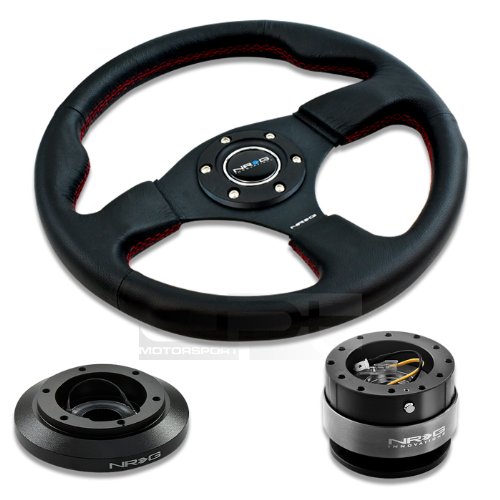 NRG-SRK-180H+012R+200BK, NRG Innovations 12.5" 320mm Black Leather Red Stitch Button Racing Steering Wheel Combo with 6 Hole Short Hub Adapter with Gen 2.0 Black Quick Release Kit SRK-180H